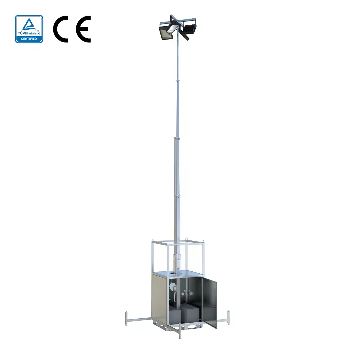 Een lichtmast huren van dit type betekent dat je altijd voldoende licht hebt om veilig te werken, dag en nacht. De mast is voorzien van een volledig afgesloten, verzinkte behuizing die de interne apparatuur beschermt tegen regen, stof en vandalisme. Dankzij de heftrucksleuven aan alle zijden en het stapelbare ontwerp is de mast eenvoudig te verplaatsen en efficiënt te transporteren, zelfs in grotere aantallen. De Sirius PRO is bovendien voorzien van een telescopische zijkoker die de bekabeling beschermt, en van een IP66-patchbox voor optimale veiligheid van de aansluitingen.