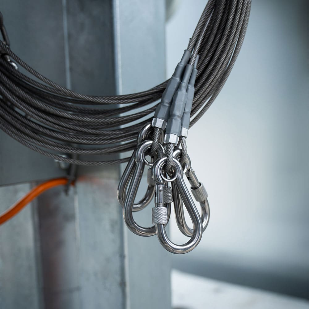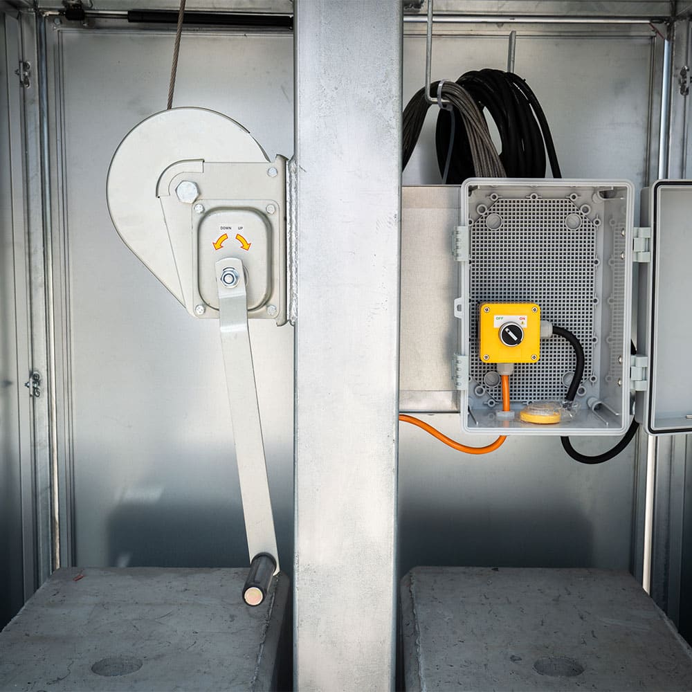 Loopt langs de mast en beschermt de kabels van de kast naar de lampen – voorkomt slijtage en kabelbreuk bij op- en neerbeweging. |